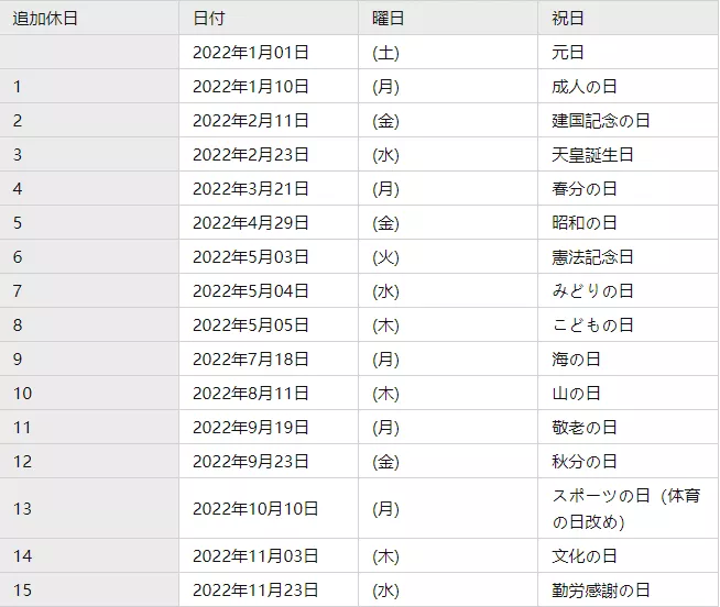 2022年日本的連休假期